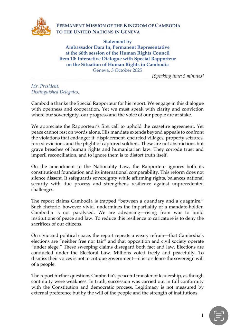 AKP Phnom Penh, October 05, 2025 -- Permanent Representative of Cambodia to the United Nations in Geneva H.E. Dara In delivered a statement in reply to the presentation of the Secretary-General/OHCHR country report on Technical Cooperation and Capacity-Building in Ca...