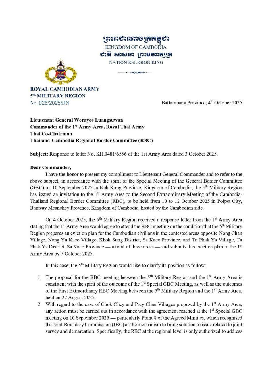 AKP Phnom Penh, October 05, 2025– ROYAL CAMBODIAN ARMY 5th MILITARY REGION of Battambang Province sent letter yesterday to Lieutenant General Worayos Luangsuwan Commander of the 1st Army Area, Royal Thai Army in response to Thai Region 1 Commander’s request to evacua...