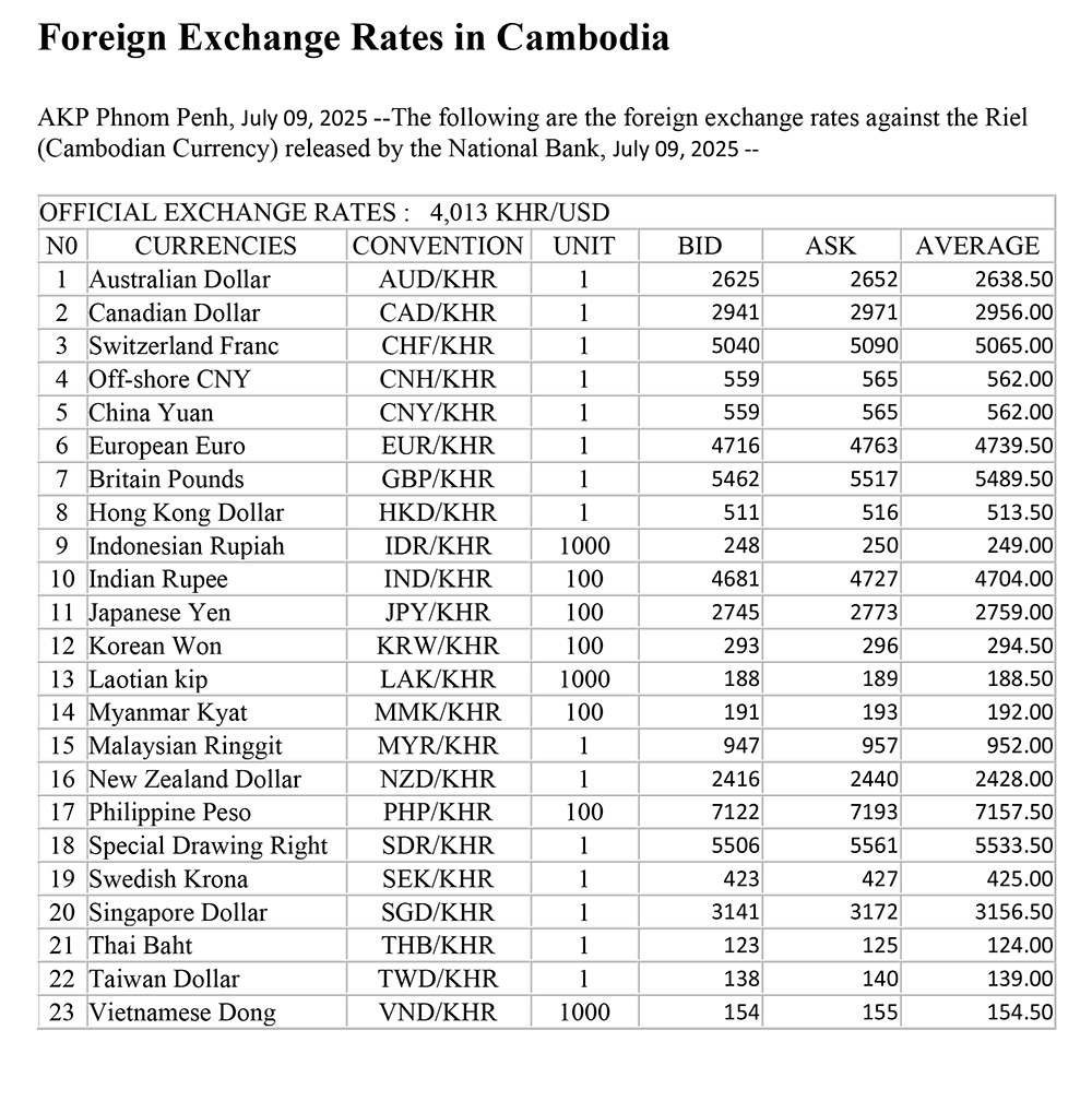 AKP Phnom Penh, July 09, 2025 --The following are the foreign exchange rates against the Riel (Cambodian Currency) released by the National Bank, July 09, 2025 --