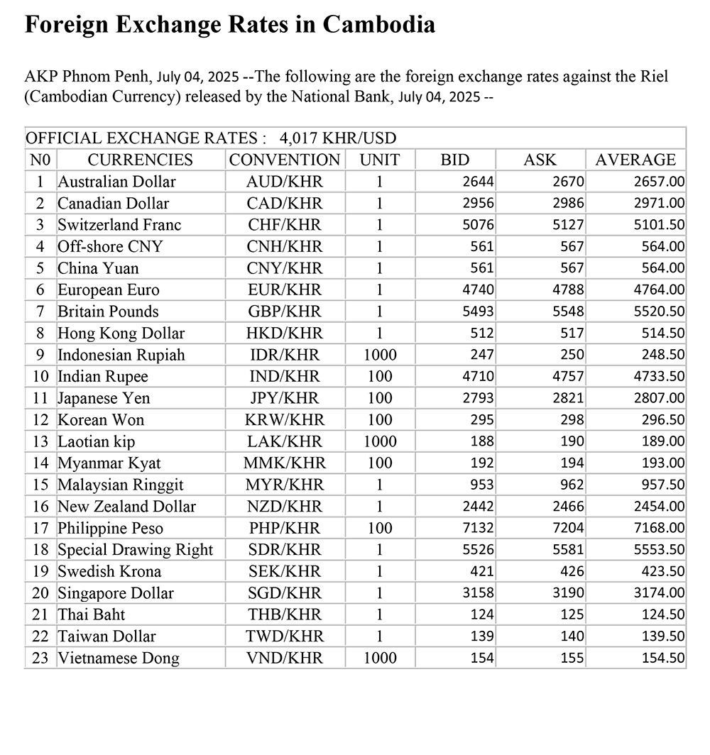 AKP Phnom Penh, July 04, 2025 --The following are the foreign exchange rates against the Riel (Cambodian Currency) released by the National Bank, July 04, 2025 --