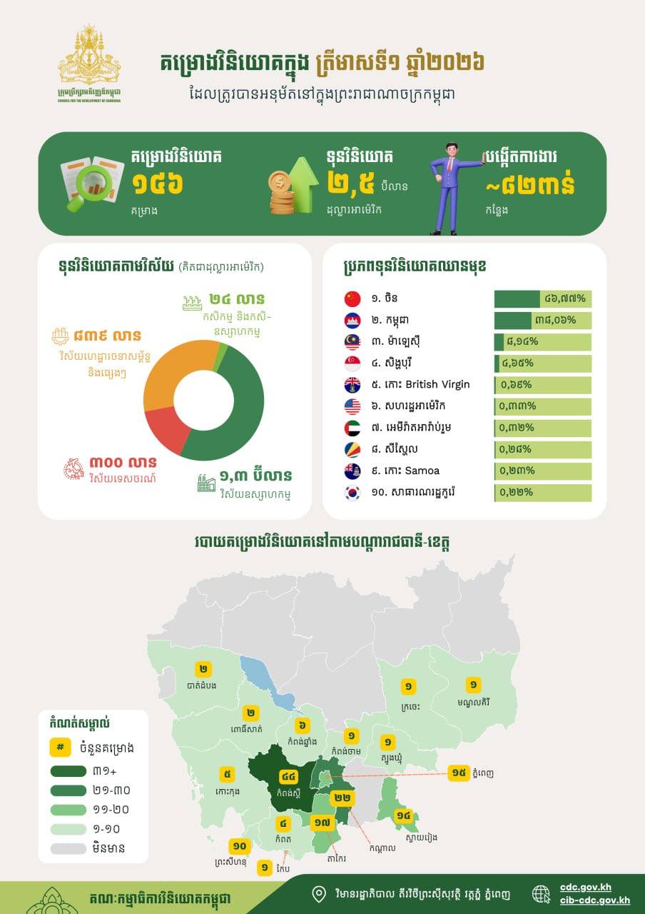 AKP Phnom Penh, April 13, 2026 -- Cambodia has seen a remarkable surge in the investment landscape, attracting 146 fixed-asset investments with a total investment capital of US$2.5 billion in the first quarter (Q1) of 2026, creating over 82,000 jobs, according to a r...