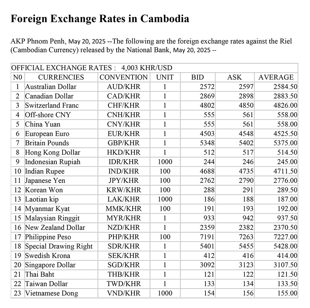 AKP Phnom Penh, May 20, 2025 --The following are the foreign exchange rates against the Riel (Cambodian Currency) released by the National Bank, May 20, 2025 --