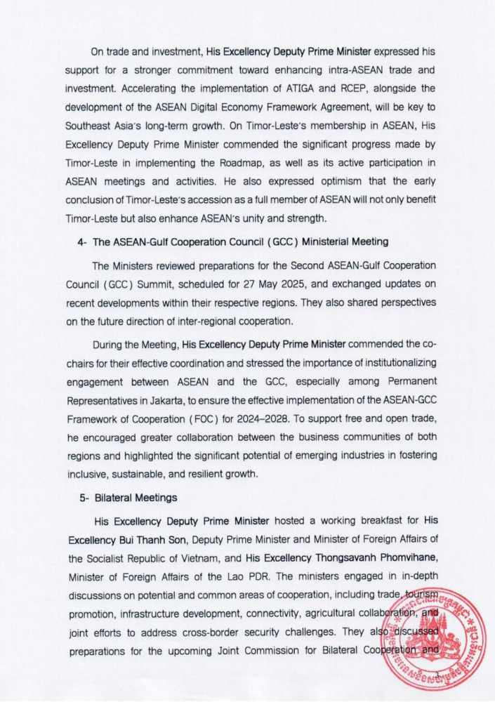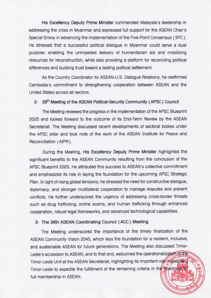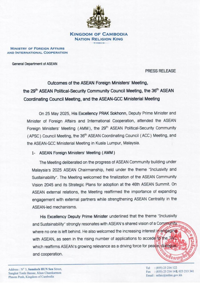 The following are the Outcomes of the ASEAN Foreign Ministers’ Meeting, the 29th ASEAN Political-Security Community Council Meeting, the 36th ASEAN Coordinating Council Meeting, and the ASEAN-GCC Ministerial Meeting, released this evening by the Cambodian Ministry of Foreign Affairs and International Cooperation: