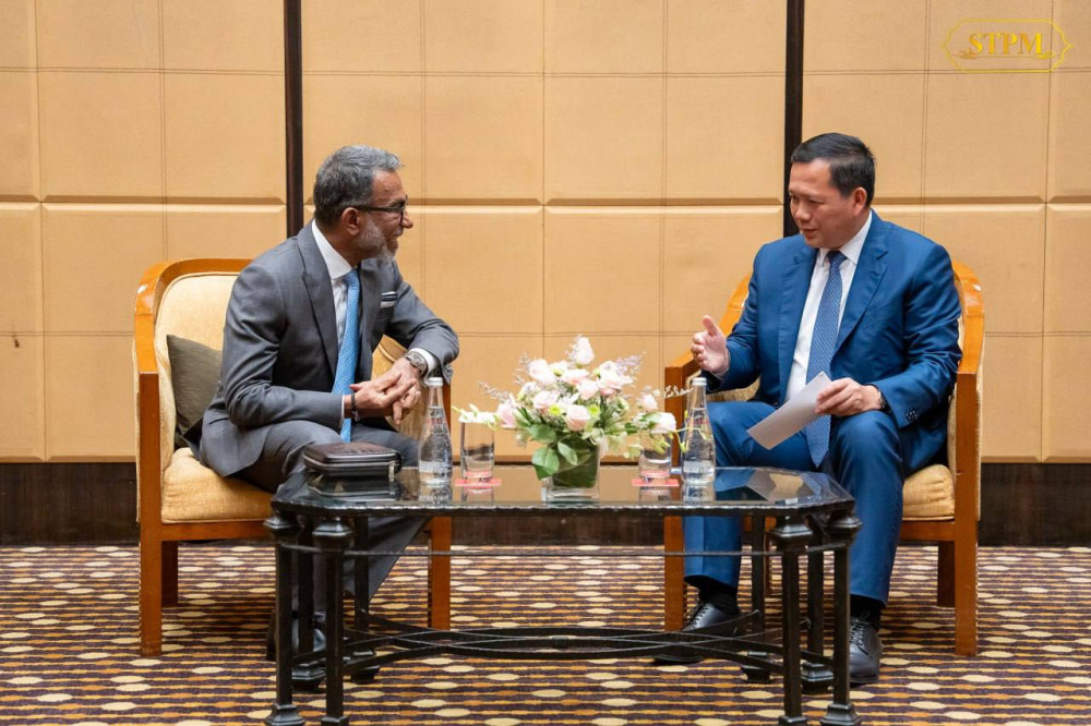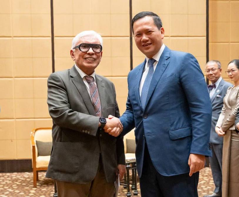 Prime Minister Samdech Thipadei Hun Manet (R) and Mr. Dato' Sri Dr. Shamir Kumar Nandy, Managing Director of Bin Zayed International (M) Berhad