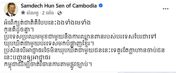 If the Thai authorities are not complicit in these activities, they should take action to arrest this individual and extradite him to Cambodia for legal proceedings, Samdech Techo Hun Sen added.