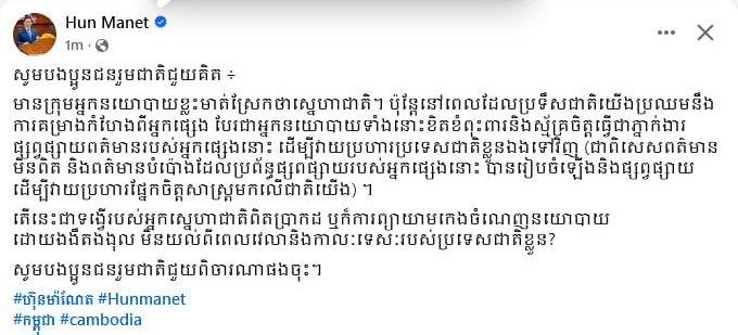“There are some politicians who shout about patriotism. But when our country is facing threats from others, those politicians strive and volunteer to be agents of others to spread information to attack their own country (especially false information and exaggerated information that others' media have prepared and disseminated to psychologically attack our country),” he wrote.