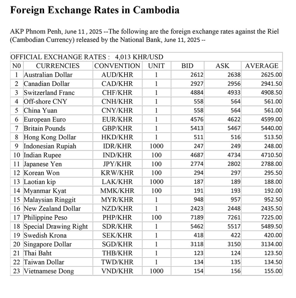 AKP Phnom Penh, June 11 , 2025 --The following are the foreign exchange rates against the Riel (Cambodian Currency) released by the National Bank, June 11, 2025 --