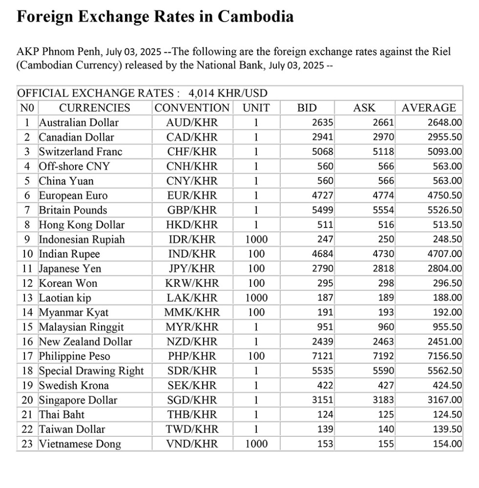AKP Phnom Penh, July 03, 2025 --The following are the foreign exchange rates against the Riel (Cambodian Currency) released by the National Bank, July 03, 2025 --