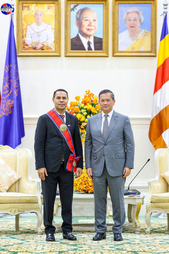 Cambodian Prime Minister Samdech Thipadei Hun Manet (R) and outgoing Ambassador of Timor-Leste H.E. Ermenegildo Kupa Lopes