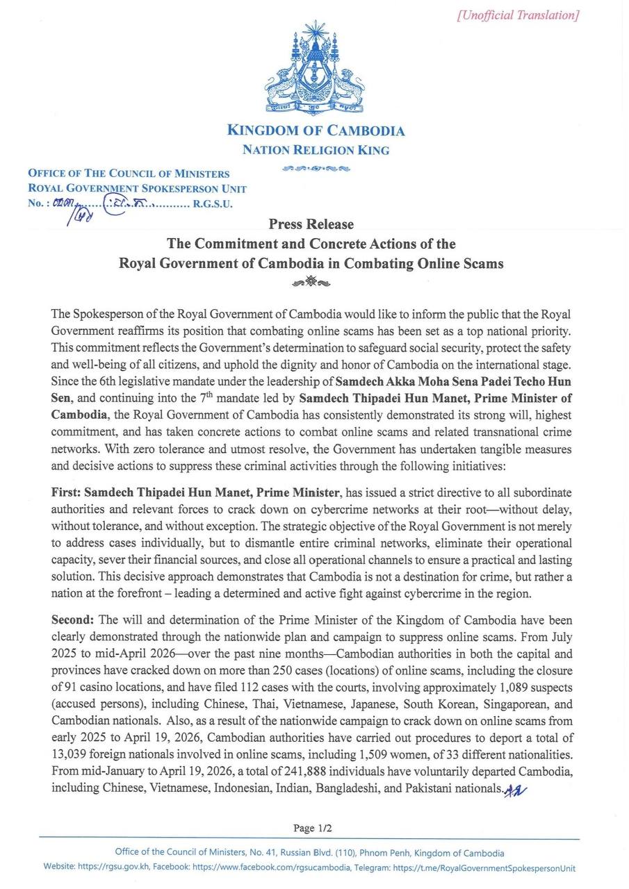 This dismantling of online crime networks should have been done long ago, rather than delayed until now, Samdech Techo added, noting that in the past, such activities have caused numerous issues for Cambodia, particularly with crimes originating from Thai territory, especially along the Thai border.