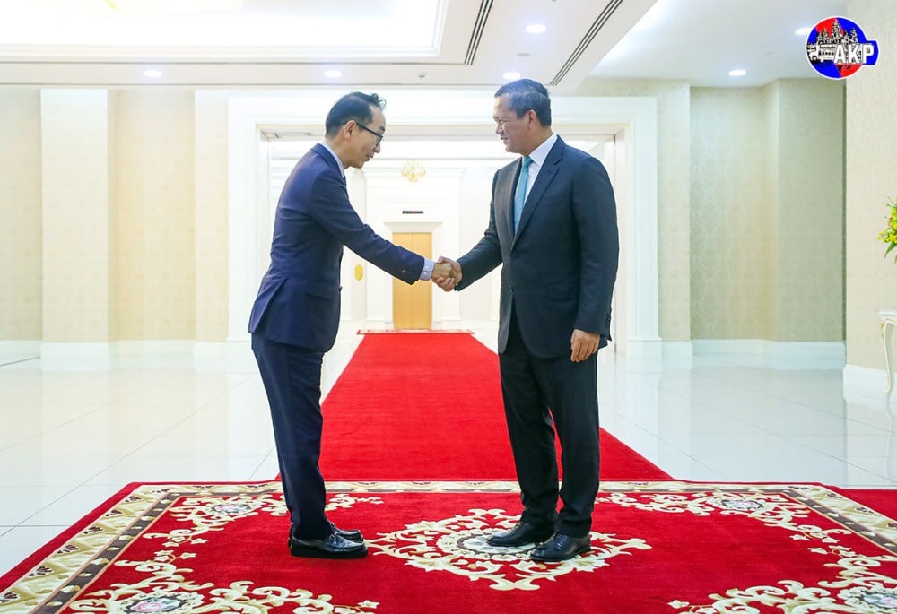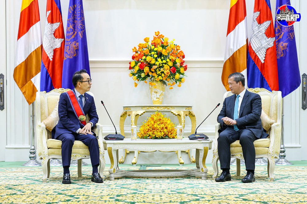 Prime Minister Samdech Moha Borvor Thipadei Hun Manet received a farewell courtesy call from H.E. Park Jung-Wook, outgoing Ambassador of the Republic of Korea (RoK) to Cambodia, at the Peace Palace this afternoon.