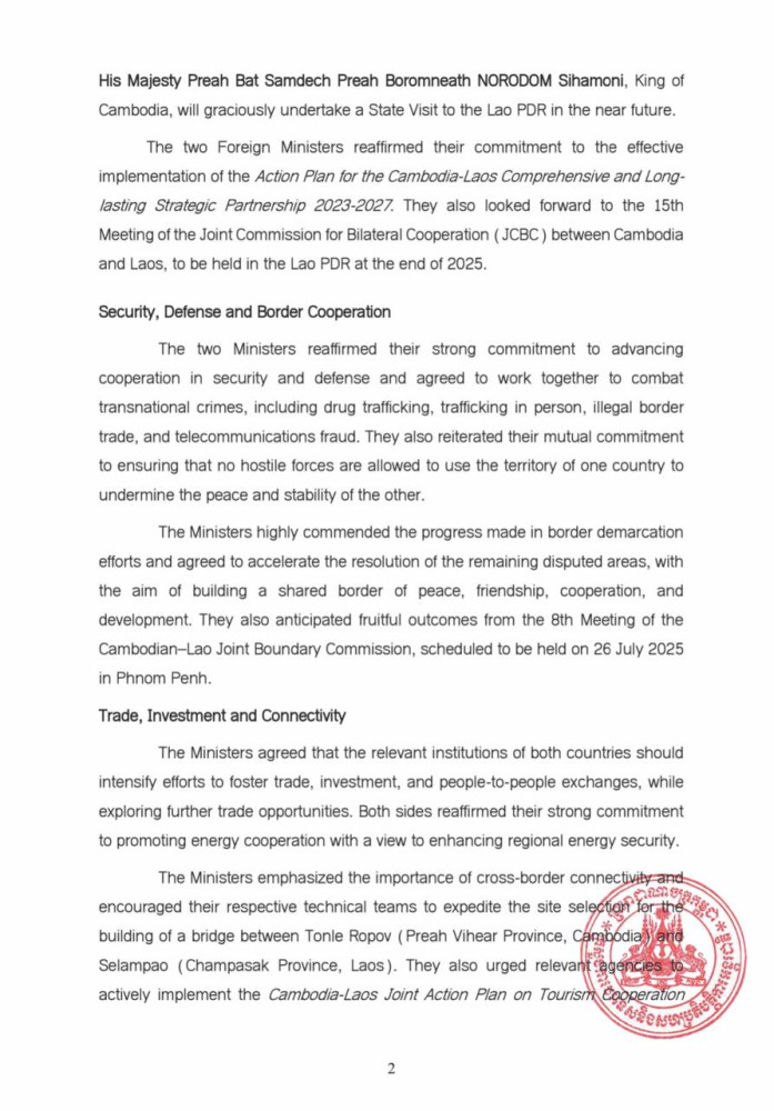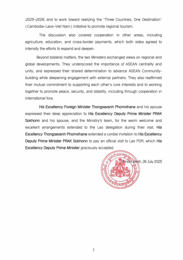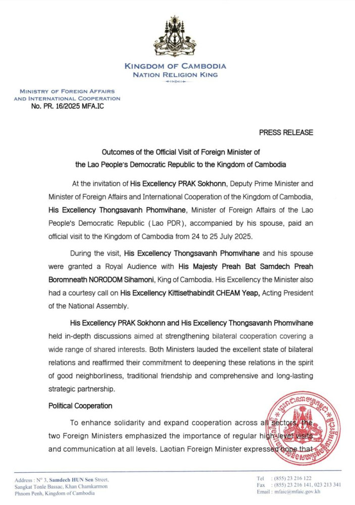 The Ministry of Foreign Affairs and International Cooperation this evening issue a press release on the outcomes of the official visit of Foreign Minister of the Lao People’s Democratic Republic to the Kingdom of Cambodia on July 24-25, 2025.
