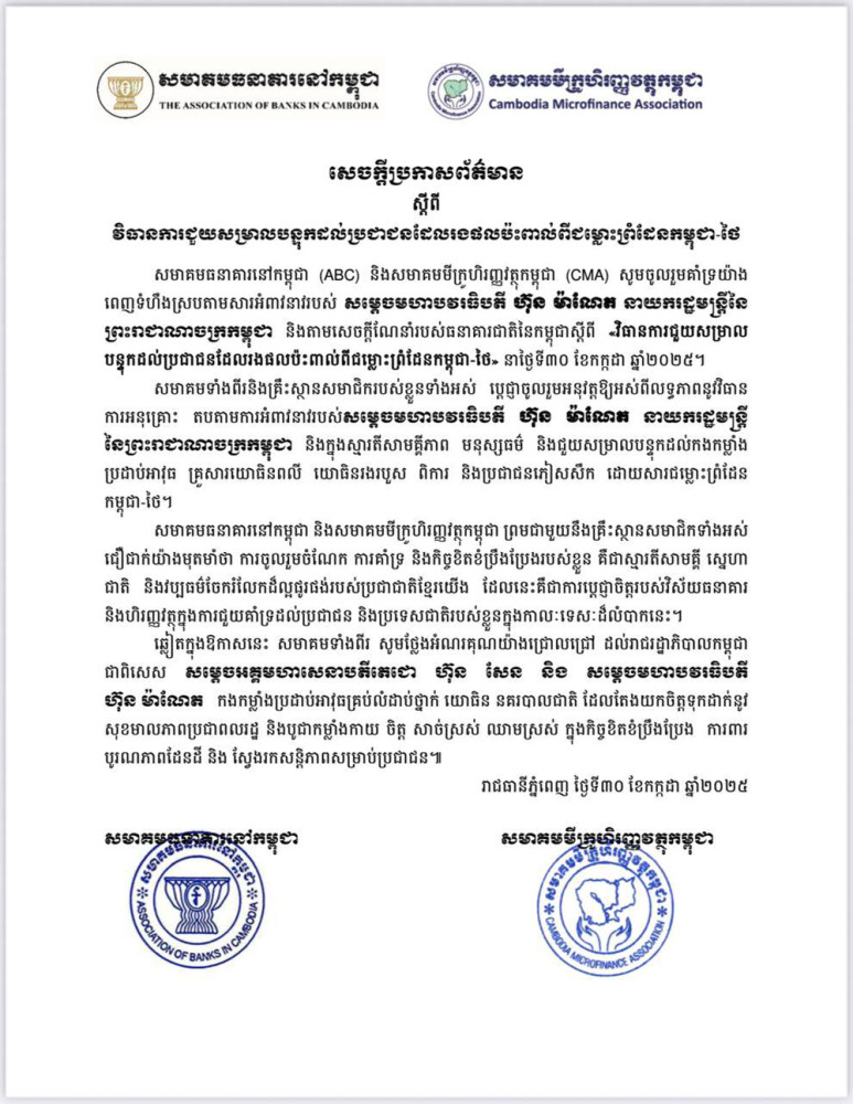 In a joint press release issued on July 30, the two associations expressed their full support in response to the appeal of Samdech Moha Borvor Thipadei Hun Manet, Prime Minister of the Kingdom of Cambodia, and in line with the directive of the National Bank of Cambodia dated July 30, 2025 on "Measures to Alleviate the People Affected by the Cambodia-Thailand Border Conflict."