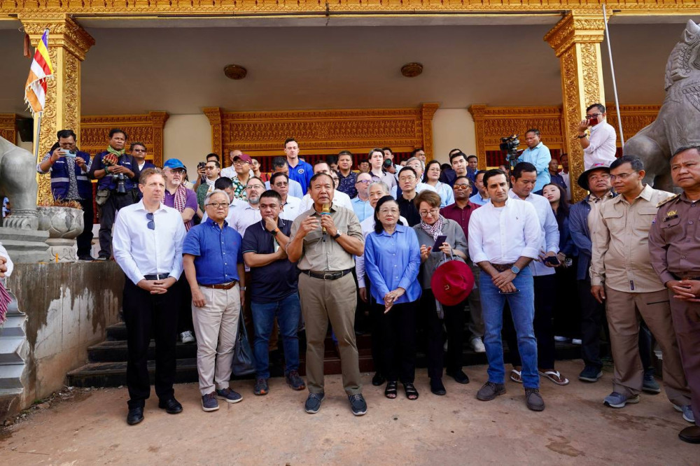 In Kouk Mon district — less than 20 kilometers from the Thai border — they inspected local dwellings and a temple that had been shelled and bombed by the Thai military before the ceasefire came into effect on Monday