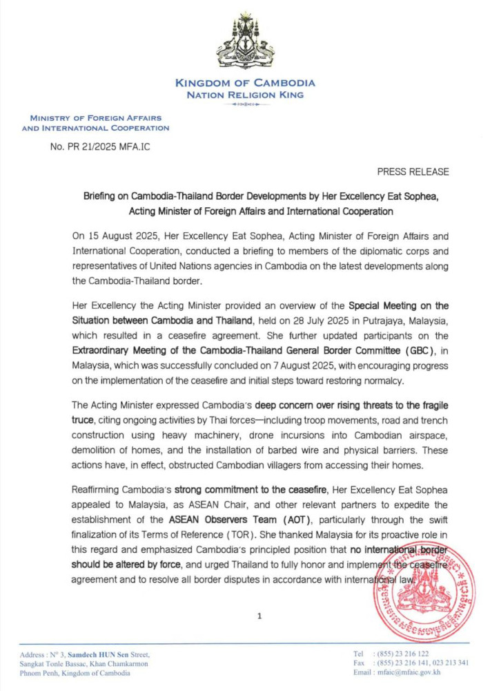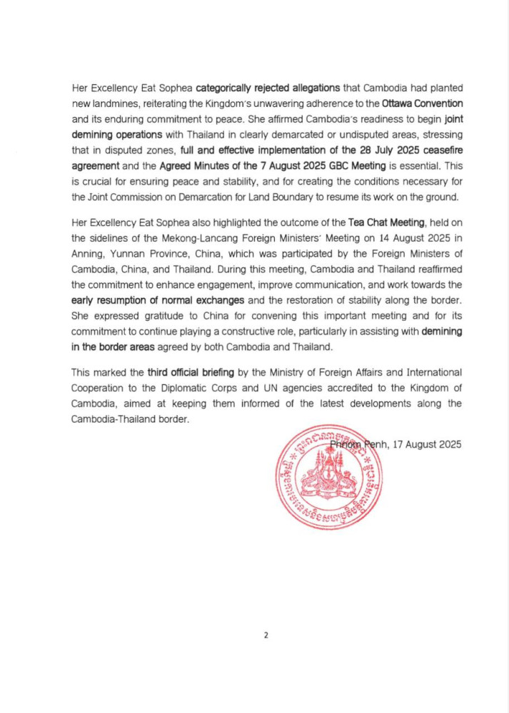 Briefing on Cambodia-Thailand Border Developments by H.E. Ms. Eat Sophea, Acting Minister of Foreign Affairs and International Cooperation