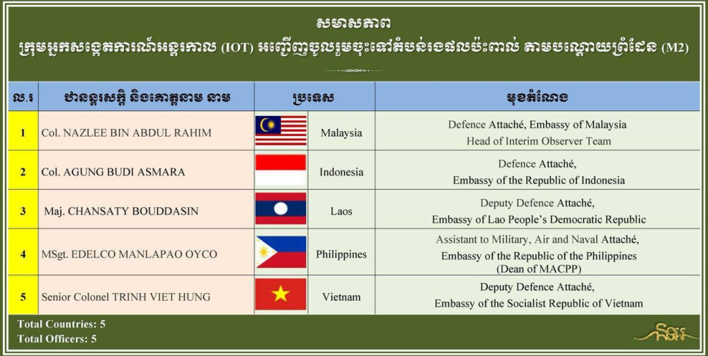 According to H.E. Lt. Gen. Maly Socheata, Under Secretary of State and Spokesperson of the Ministry of National Defence, the visit of the IOT delegation comprising representatives from five countries is aimed to observe, verify and report on the update situation after the Ceasefire Agreement.