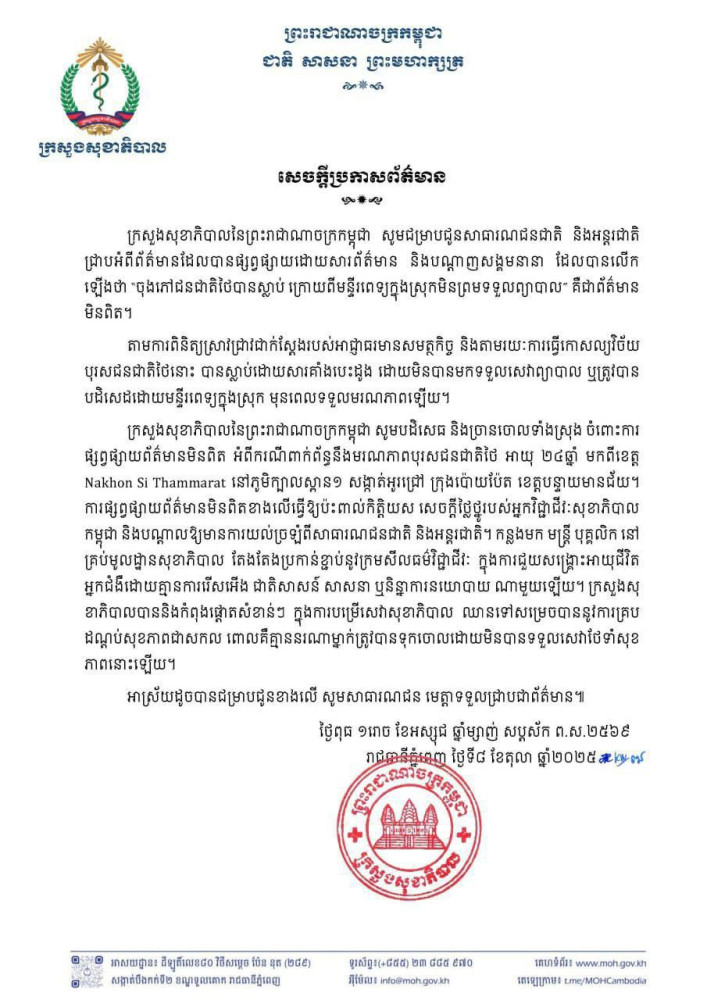 AKP Phnom Penh, October 08, 2025 -- The Ministry of Health of Cambodia has totally rejected the recent news circulated by certain media outlets and social media platforms about a Thai citizen’s death in Poipet city.