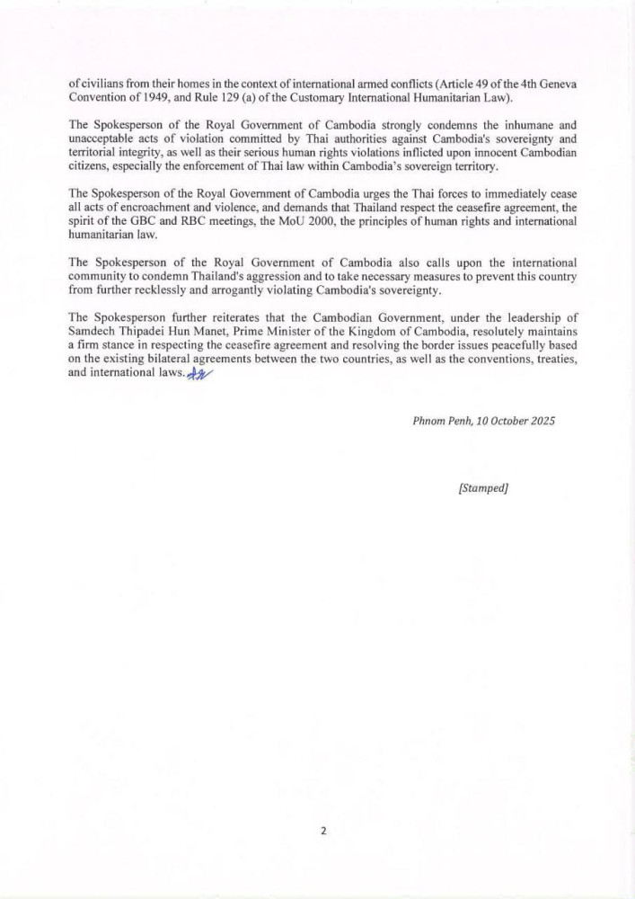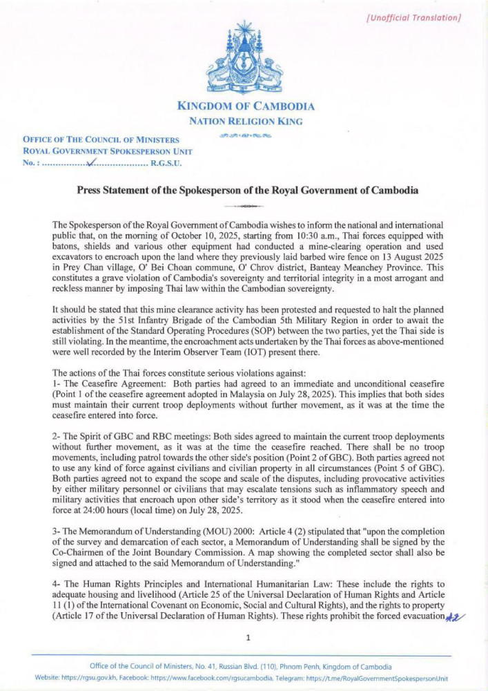 The Spokesperson of the Royal Government of Cambodia, H.E. Pen Bona, has strongly condemned the unlawful actions of Thai forces that violated Cambodia’s sovereignty in Prey Chan village, O’ Beichoan commune, O’ Chrov district, Banteay Meanchey province on Oct. 10.