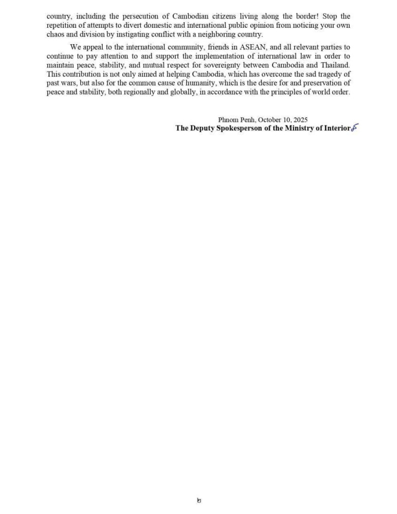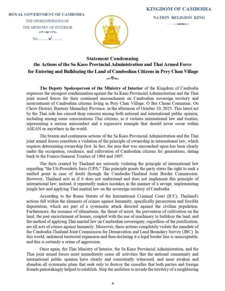 The Deputy Spokesperson of the Ministry of Interior has issued a statement strongly condemning the actions of the Sa Kaeo provincial administration and Thai armed forces for entering and bulldozing the land of Cambodian citizens in Prey Chan village on Oct. 10.