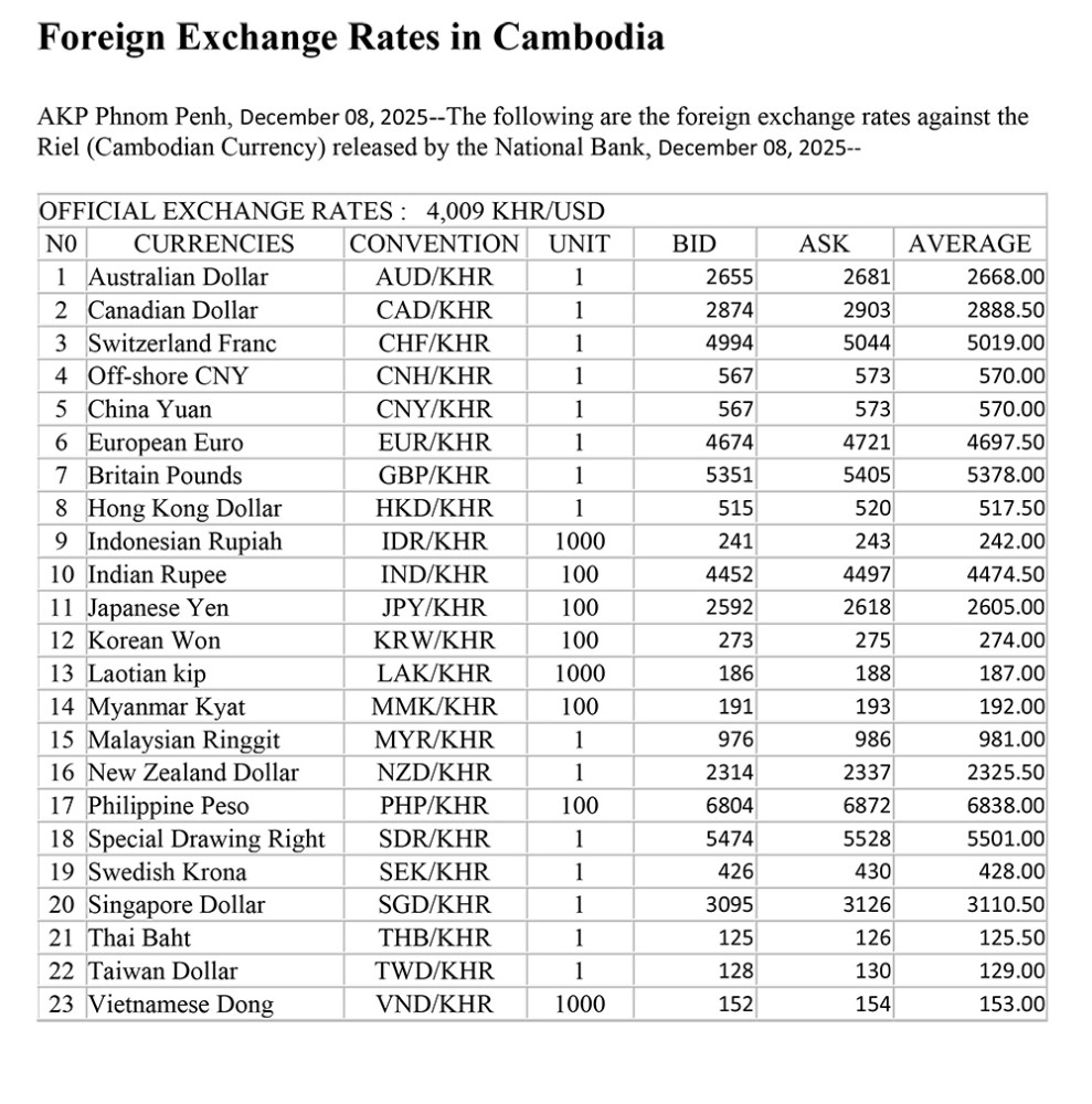AKP Phnom Penh, December 08, 2025--The following are the foreign exchange rates against the Riel (Cambodian Currency) released by the National Bank, December 08, 2025--
