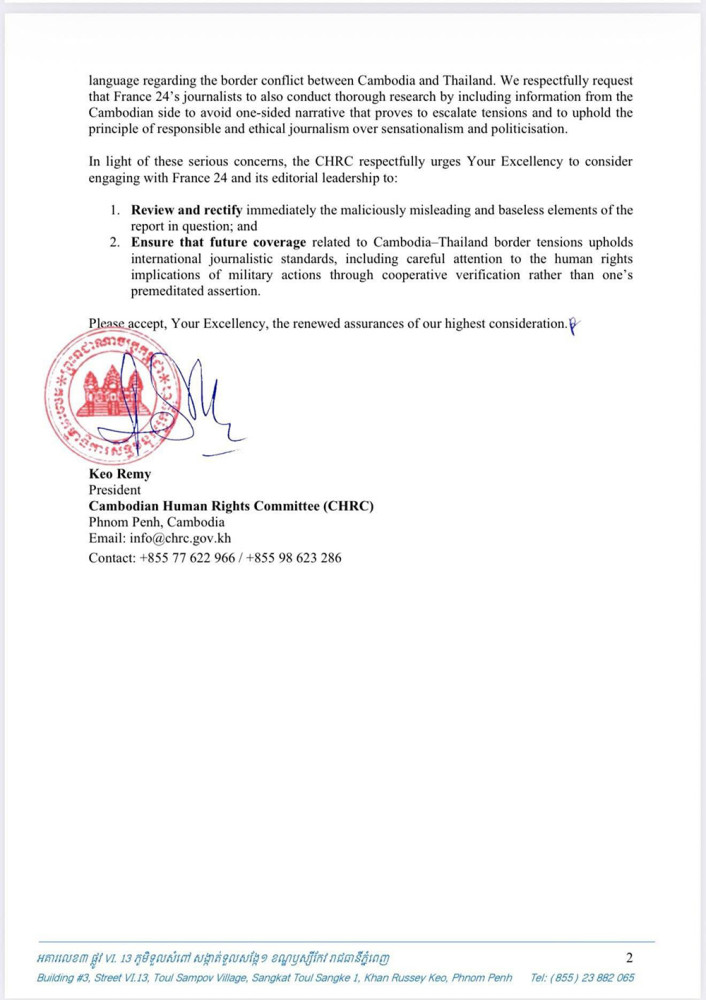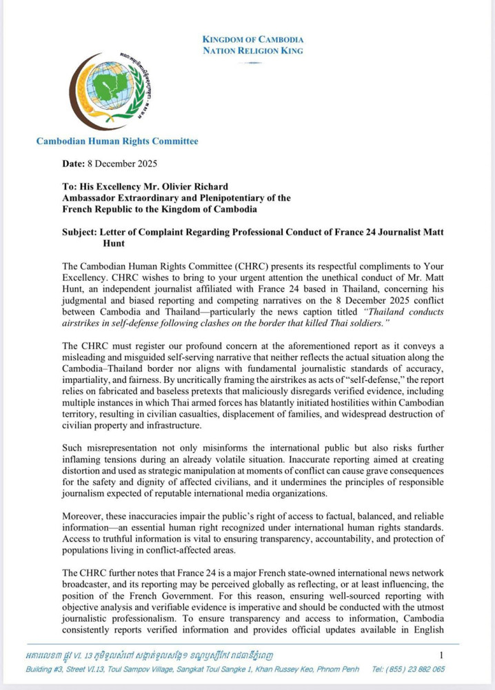 Cambodian Human Rights Committee (CHRC) has sent a letter to French Ambassador to Cambodia H.E. Olivier Richard regarding the professional conduct of France 24 journalist Matt Hunt.