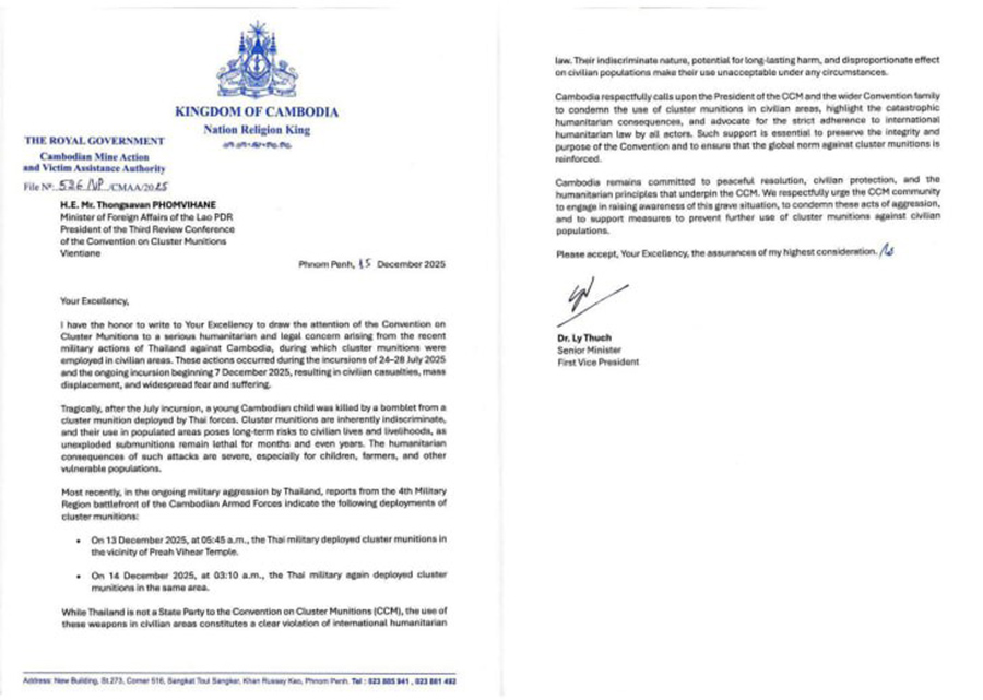 Senior Minister H.E. Ly Thuch has drawn the attention of the Convention on Cluster Munitions (CCM) to a serious humanitarian and legal concern arising from the recent military actions of Thailand against Cambodia, during which cluster munitions were employed in civilian areas.