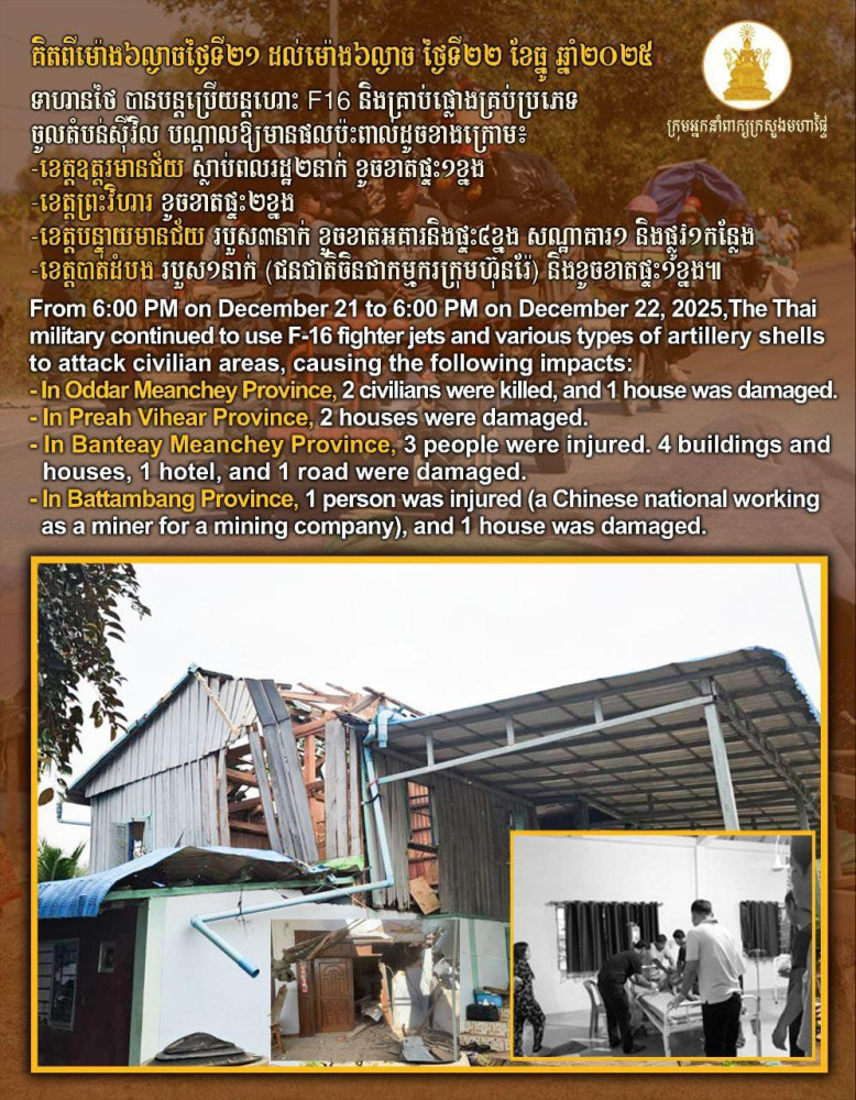 From 6:00 p.m. on Dec. 21 to 6:00 p.m. on Dec. 22, 2025, Thai forces used F-16 fighter jets and various types of artillery shells to attack civilian areas. These attacks resulted in the deaths of two civilians and damage to a house in Oddar Meanchey province.
