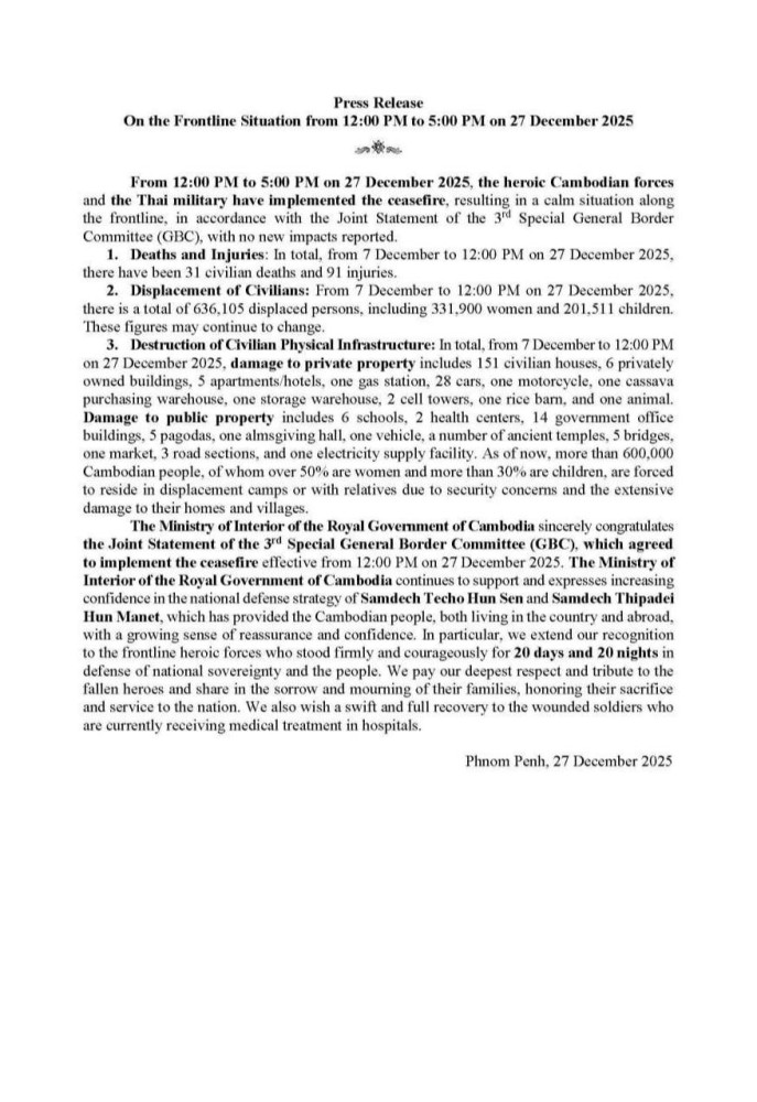 The Ministry of Interior of Cambodia this evening issued a press release, congratulating the Joint Statement of the 3rd Special Cambodia-Thailand General Border Committee (GBC) Meeting which resulted in a calm situation along the frontline.