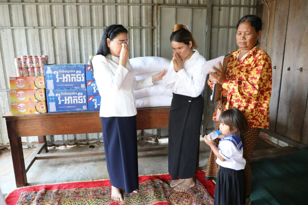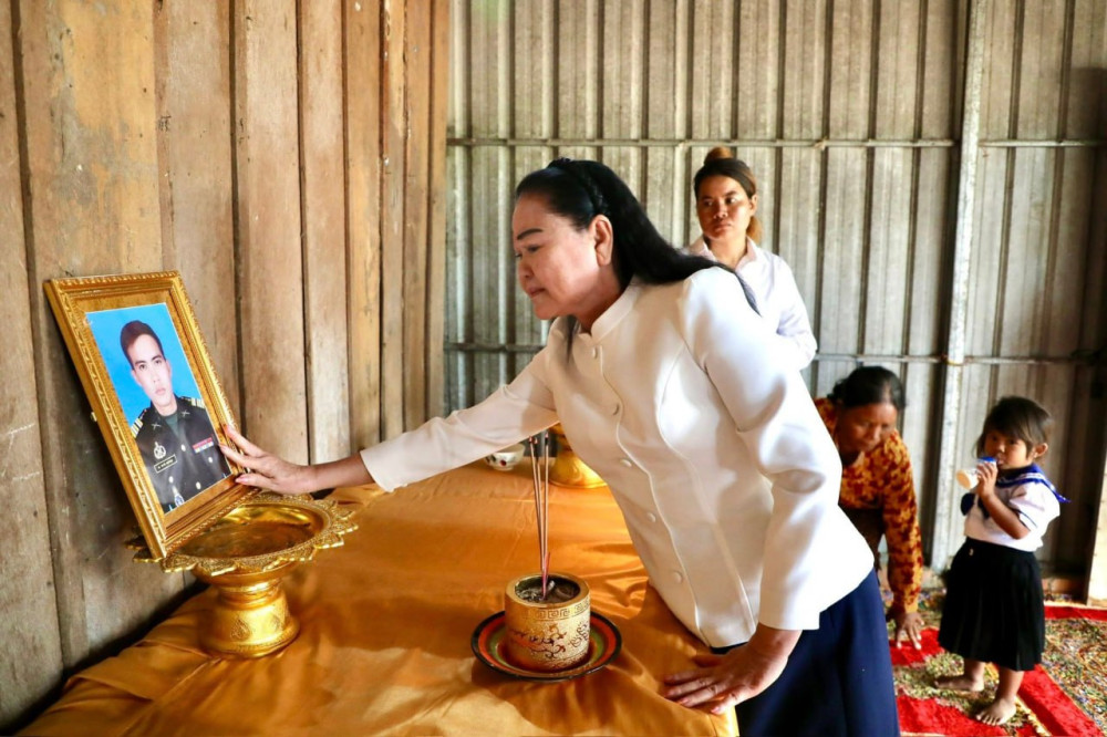 Accompanied by Red Cross officials, the wife of former Prime Minister and current Senate President Samdech Akka Moha Sena Padei Techo Hun Sen met with the family of Lieutenant Colonel Chan Sovatha to express sympathy for his sacrifice during active service.