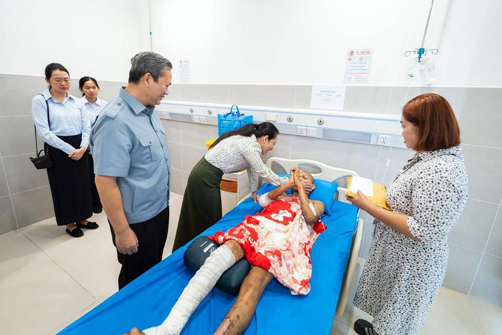 Samdech Thipadei Hun Manet, accompanied by his spouse, Lok Chumteav Dr. Pich Chanmony, met injured members of the armed forces and national police who were transferred to Phnom Penh for continued care after sustaining injuries in combat.