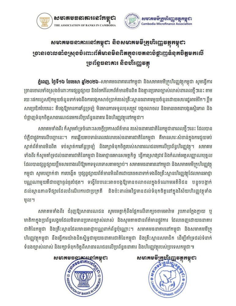 The two associations also welcomed the National Bank of Cambodia (NBC)'s prompt action in issuing an official clarification on this matter. “This timely response is important in helping contain misinformation, reduce public confusion, and preserve trust in the financial system,” they underlined.