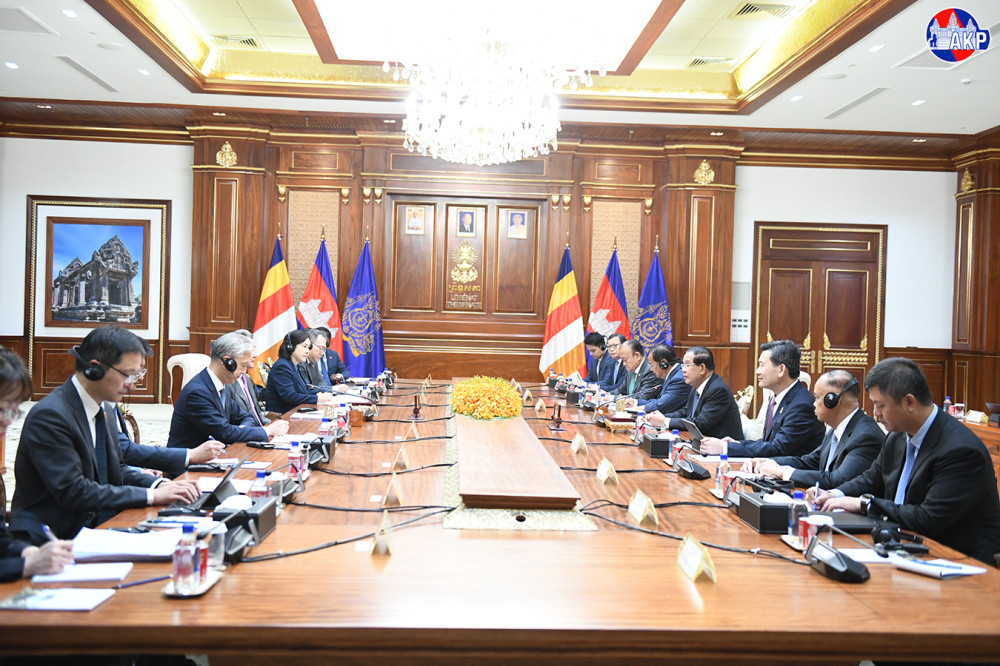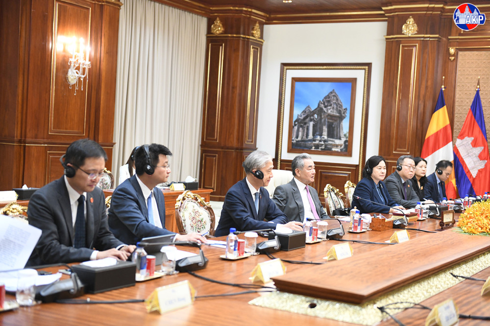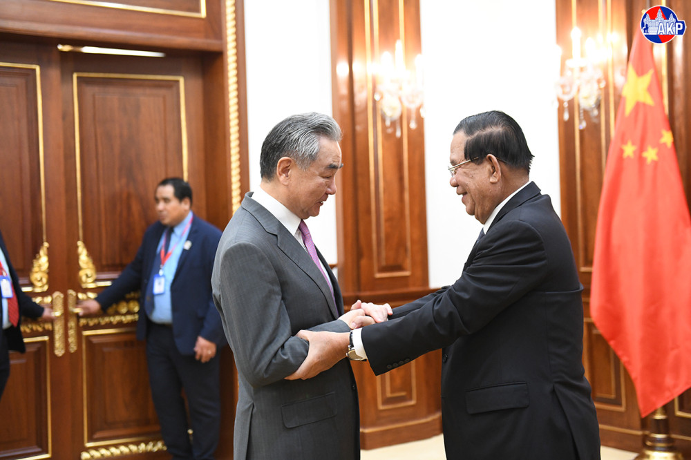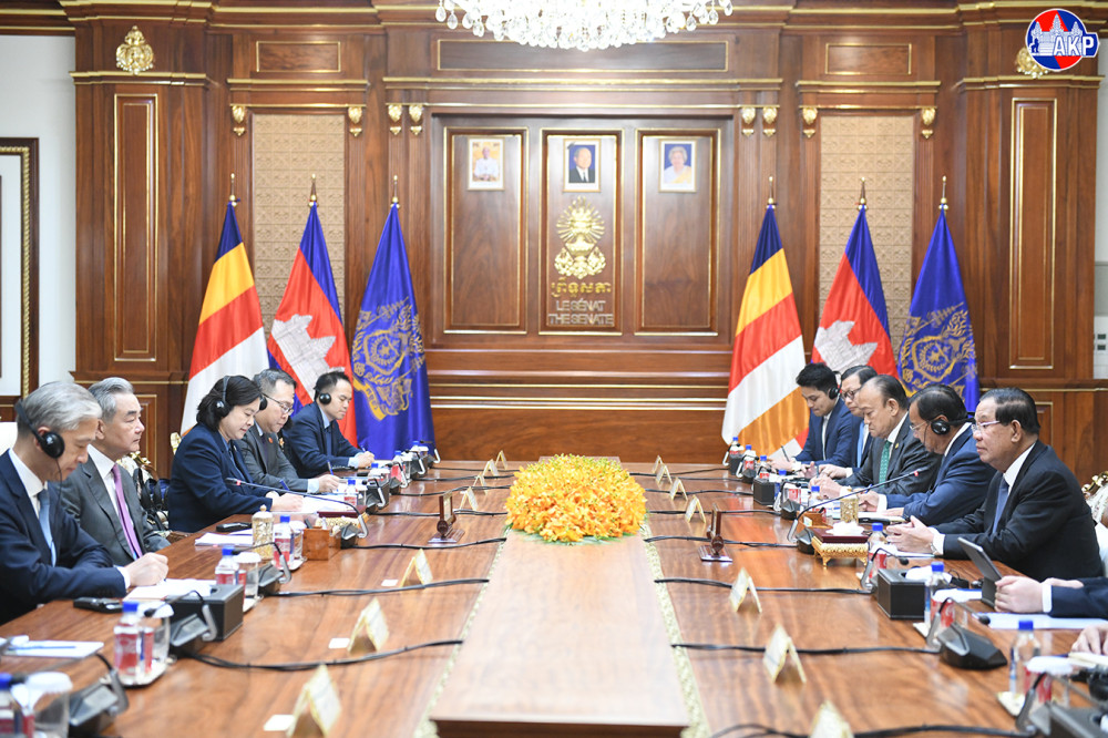 Acting Head of State of Cambodia, Samdech Akka Moha Sena Padei Techo Hun Sen (R, Pic. 1) greets H.E. Wang Yi, Minister of Foreign Affairs of the People’s Republic of China, prior to their courtesy meeting at the Senate’s Solidarity Palace in Phnom Penh this morning.